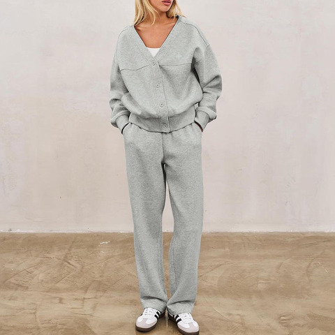 ชุดสูทสองชิ้นสำหรับผู้หญิงเสื้อคาร์ดิแกนมีกระดุมทรงหลวมชุดวอร์มขากว้าง100% ผ้าฝ้ายทรงตรงแบบลำลองตามสั่ง